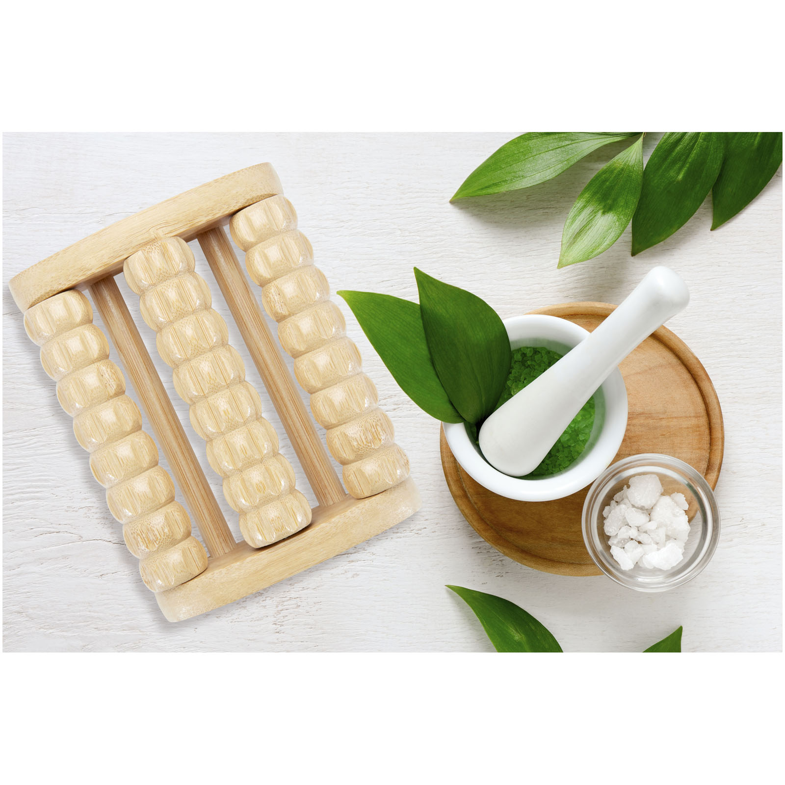Fußmassageroller aus Bambus mit 3 Reihen von Massagewalzen und Anti-Rutsch-Material auf der Unterseite. Legen Sie das Massagegerät einfach auf den Boden und bewegen Sie dann Ihre Füße darüber, um ein angenehmes Entspannungsgefühl zu erreichen. Der verwendete Bambus wird nach nachhaltigen Normen beschafft und produziert.